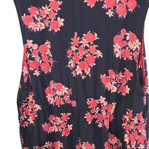 Pleione navy duster kimono cardigan vest with a vibrant red and pink floral print. This sleeveless layering piece features an open front and a cinched waist detail for a flattering silhouette. Side slits add movement and style. Perfect for adding a touch of flair to any outfit, ideal for casual outings, vacation wear, or as a stylish beach cover-up.