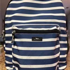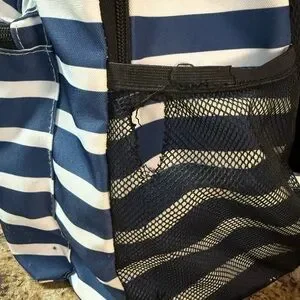 Stylish backpack with blue and white stripes. Features a front zip pocket. Small rip in side mesh cup holder see photos.