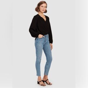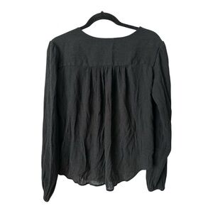 Chic black V-neck blouse. Long sleeves with a relaxed fit. Ideal for casual or dressy looks.