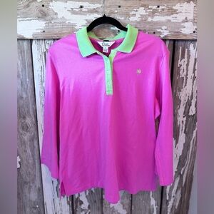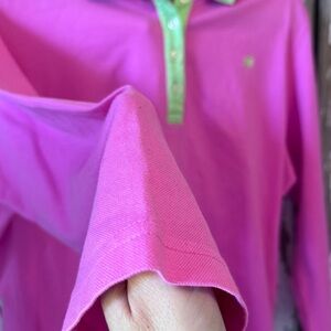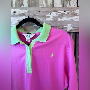 This Lilly Pulitzer polo shirt features a striking combination of pink and green, making it a standout piece in any wardrobe. Crafted from a comfortable cotton blend, it offers a classic polo collar design perfect for casual outings. The vibrant colors and sporty style ensure you make a bold fashion statement.