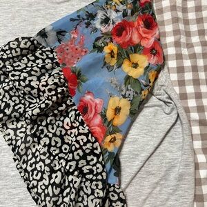 Stylish gray top with vibrant floral sleeves. Features a mix of red, blue, and yellow flowers. Perfect for casual wear.