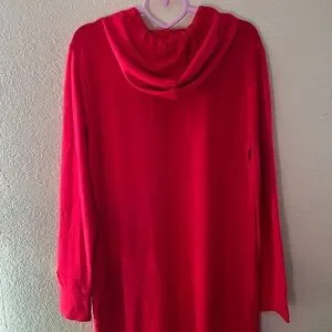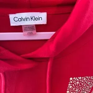 Stylish red hoodie dress with Calvin Klein logo. Features a drawstring hood and long sleeves. With gold studding/bling bling