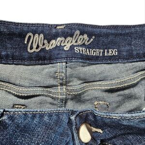 Wrangler straight leg jeans feature a medium to dark blue wash with a vintage-inspired fade, offering a timeless look. Crafted from quality denim, these jeans ensure both comfort and durability. #379