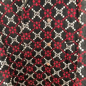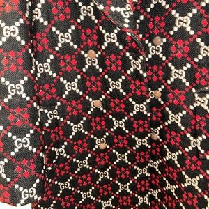 Stylish Gucci pea coat with bold black and red pattern. Features iconic logo design. Double-breasted front. Perfect for a sophisticated look.