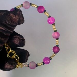 • Accent Details: Each purple bead is framed with tiny multitone metallic seed beads in blue-green and violet hues, separated by gold tone metallic seed bead sections