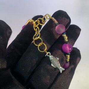 PLUM TIDES — Designer Purple Gold Glass Bead & Copper Bracelet with Fish Charm