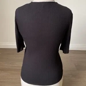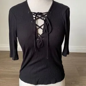 Topshop Black Ribbed 3/4 Sleeve Top w Lace-up Details Nordstrom