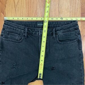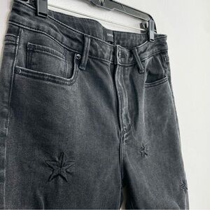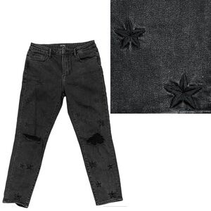 Beautiful black embroidered stars all over the jeans. Manufactured distressing and rips.