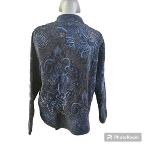 This cute jacket goes just as well with a pair of jeans as it does all dressed up. Made up of multiple colors including blues, black, and tans. It is in great used condition.