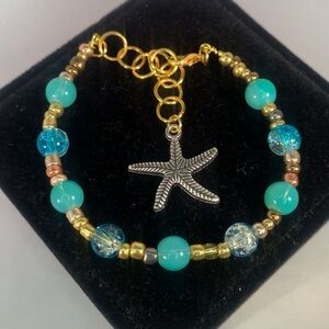 COASTAL ORBIT — Handmade Gold and Aquamarine Starfish Charm Glass Bead Bracelet