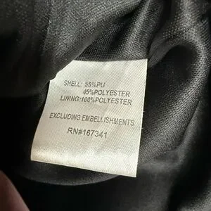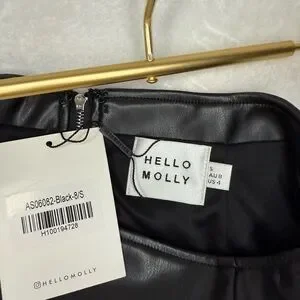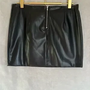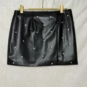 This is a black faux leather mini skirt with small slit and bedazzled studded front.