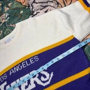Rare vintage 80s Cliff Engle NBA Los Angeles lakers knit crewneck sweater in cream/purple/yellow. Acrylic/wool blend material. Size large. Made in USA. Pre owned, minimal to light wear, good condition over all as seen!