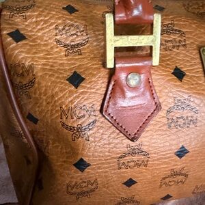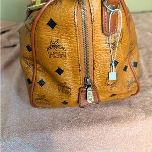 Vintage MCM Visetos Boston bag in cognac coated canvas with leather trim and gold-tone hardware.