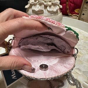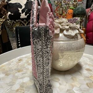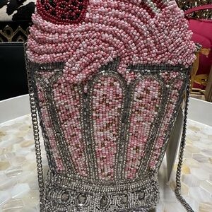 Chic and stylish made in India beaded bag in pink and silver shaped like a strawberry shake! So fun and pretty silver hardware with magnetic snap. Perfect for adding a touch of fun to any outfit, it’s a stunning handbag so different!