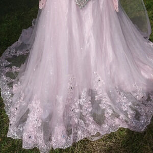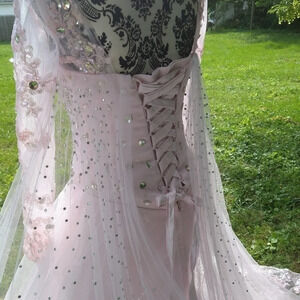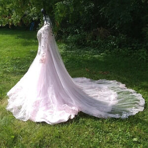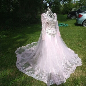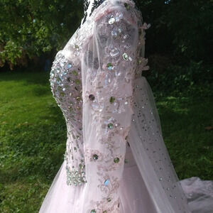 Custom made beautiful dress fit for royalty! Layers of tulle and lace adorned with jewels, sweetheart neckline, long sheer lace jeweled sleeves, back lacing system with zipper at the end. A fantasy dress made for a beautiful person to commemorate a perfect day.