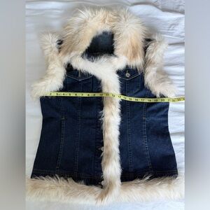 Vintage Denim Vest w Fox Fur Trim Womens Large 70s disco Y2K Mob Wife Penny Lane