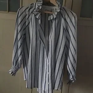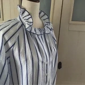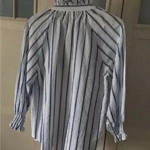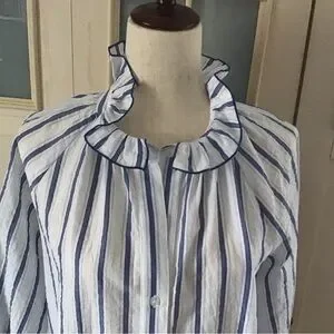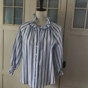 Finley Fiona Ruffle High Neck Blouse Blue/White Striped XS 100% Cotton