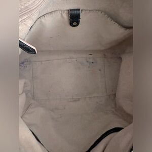 Pale pink edging on the strap and pale pink leather lining. The lining is pretty marked with pen/makeup.