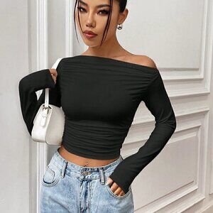 Black Casual Women's Asymmetrical Collar Pleated Long Sleeve T-Shirt