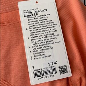 Lululemon Woman’s Coral Long Sleeve Swiftly Tech, Size 2, Hip Length. NWT.