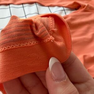 The Lululemon Woman’s Coral Long Sleeve Swiftly Tech in size 2 is a hip-length t-shirt designed for active women. Made from a blended fabric, this solid orange top features a crew neckline and pullover closure. Perfect for running and jogging in the summer, fall, and spring seasons, this basic style top is machine washable and brand new with tags. With its long sleeves and strapless design, this Lululemon Swiftly Tech top offers comfort and functionality for women on the go. Tags come with item, but are not connected to item.
