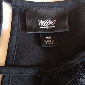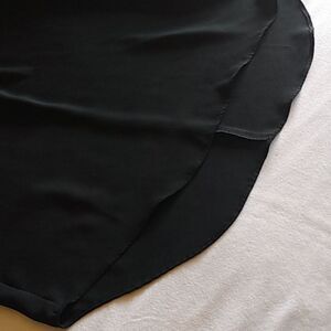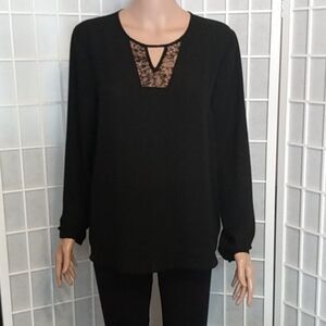 Wassio black long sleeve blouse with rounded neckline and a v-shaped lace at the neck. High - low.