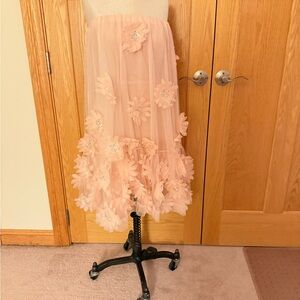 Beaded blooms sway and sparkle across a strapless party dress turned out in a peachy hue.