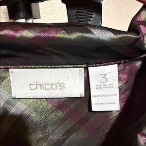 Chico's bomber jacket with a metallic plaid pattern. Features zip front and drawstring collar. Adds a chic touch.