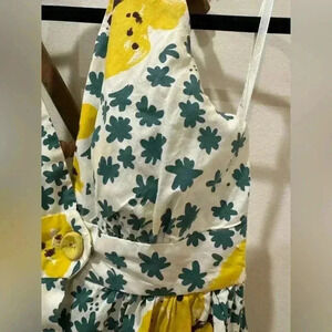 Stunning vintage Betsey Johnson halter top dress with pockets!! The design is super cute with flowers and butterflies and it’s in good- used condition. small flaws show (light discoloration, and one button coming undone)