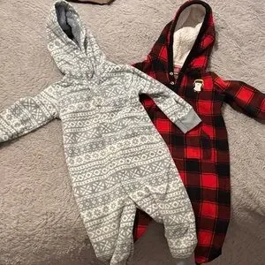 Cozy one pieces with hood. Gray with snowflake pattern. Red plaid with bear detail.