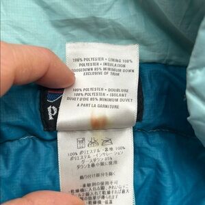 Light blue quilted down vest by Patagonia designed for lightweight warmth and packable insulation. Features a full zip front, stand collar, zippered hand pockets, and adjustable drawcord hem. Insulated with 85% minimum goose down for reliable warmth without bulk. Ideal for hiking, travel, outdoor activities, and everyday layering in cool weather. Classic Patagonia puffer style with durable ripstop shell and breathable lining.