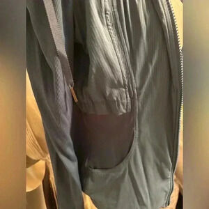 This jacket is blue, reversibles and breathable. It has thumb holes to keep your hands warm and a hoodie. It’s a size 8.