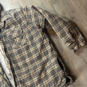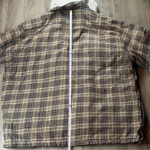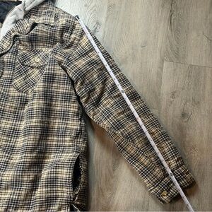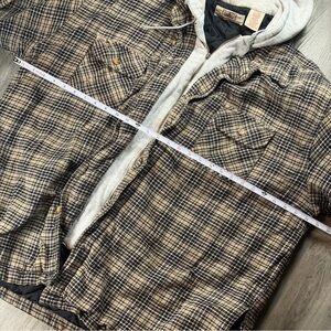 Color: Brown and black plaid outer shell with grey hood insert and black quilted interior lining.