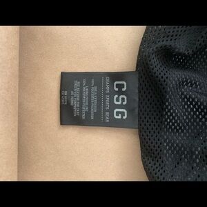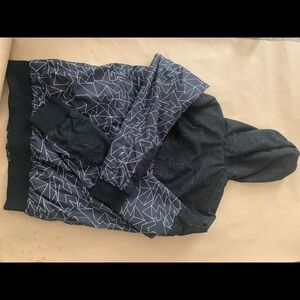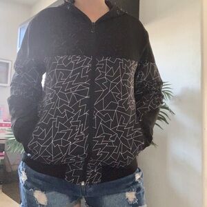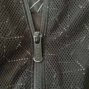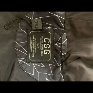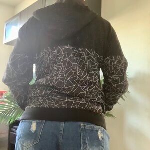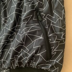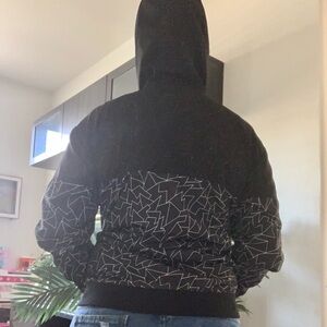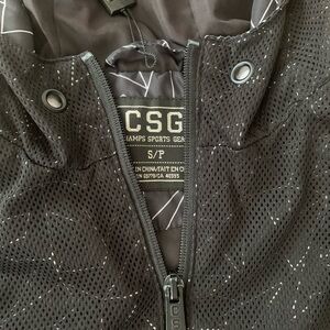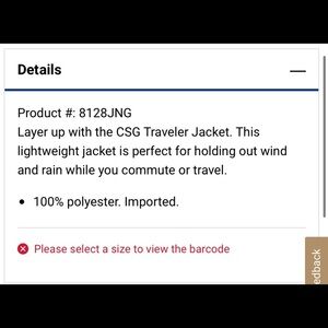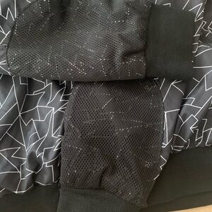Quality jacket in excellent condition. The string is missing from the hoodie part. I believe it’s a men’s small, I wear med-large jackets and it fits me well. Lightweight, washable, 2 front zipper pockets, no stains or tears. 100% polyester