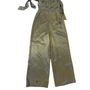 Chic satin jumpsuit in olive. Features a stylish one-shoulder design. Perfect for a night out.