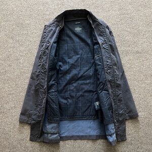 The exterior of the coat a blue-ish sort of grey and it is a very unique material. It feels similar to a waxed jacket, but also a little bit like micro suede or nubuck. I am not exactly sure how to describe it but it has a soft and weighted feel to it.