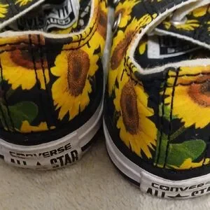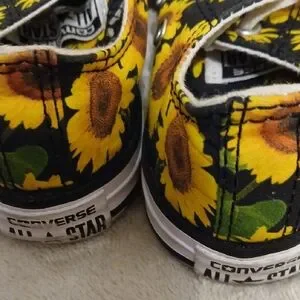 Vibrant sunflower design on classic Converse sneakers. Black canvas with bright yellow flowers. Perfect for playful adventures.