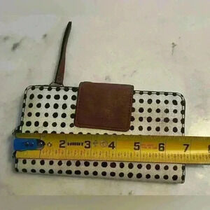 Great size/very roomyh Fossil wallet. Cute white with black dots design. Does have an area where leather has worn off (see pics).