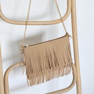 Features: Compact crossbody with faux leather and suede combo, featuring a stylish fringe accent. Zipper closure keeps your essentials secure, interior includes slip pockets and a zipper pocket for organization. Removable wristlet and chain shoulder strap add styling options for day or night.