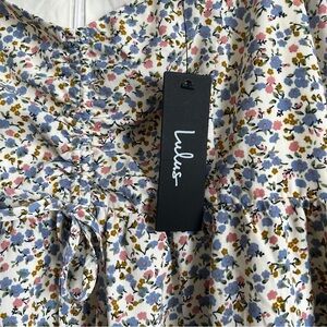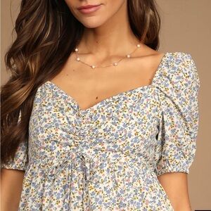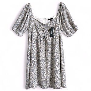 Lulus Floral Print Puff Sleeve Cinch Bodice Mini Dress Off White Blue XL NWT