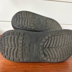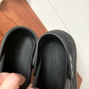 Stylish black platform crocs. women in size M6 or W8. Featuring the Crocs logo accent, these clogs are a timeless addition to any wardrobe. Good used condition - just have some dirt but no big flaws. I believe these ran small, so please ask questions. Fun option to the classic crocs!
