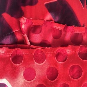 Shades of red, black, exposed zipper on back, minor snags and hem flaw see pic,colors may vary due to lighting, used condition, size M