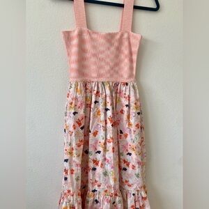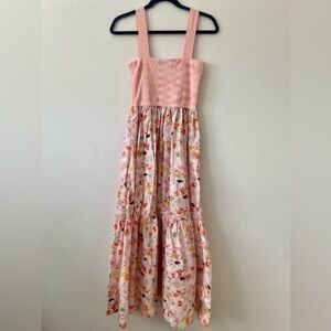 A solid pink bodice accentuates the flouncy floral skirt of this Tana Taylor Gianna dress featuring a sunny sleeveless design complete with a sweater-knit bodice sporting a breezy back cutout. The dress also features hidden side-zip closure, scoop neck and is maxi length. It retails for $495 and is in perfect condition with no visible wear.