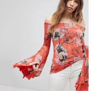 Sexy off-the-shoulder printed top featuring ultra dramatic flared sleeves.