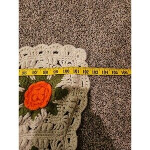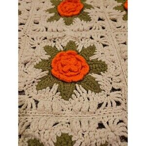 This is a very cool vintage handmade crochet blanket/comforter and is a California King-sized bed throw, measuring 102 inches in length and 91 inches in width. This has a beautiful floral pattern in beige with orange flowers, giving it a retro and vintage style.