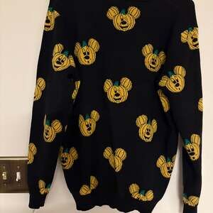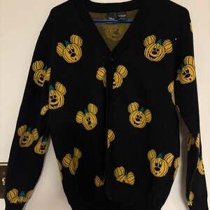 Unleash your inner Disney fan with this festive Cakeworthy x Disney Mickey Mouse Jack-O'-Lantern cardigan in women's size XL. This black cardigan features an all-over pattern of smiling Mickey Mouse jack-o'-lanterns, perfect for Halloween and autumn celebrations. It's a fun and unique piece that brings a touch of Disney magic to your wardrobe. The item is in new condition, with original tags, ready to be worn and enjoyed. Ideal for Disney collectors or anyone looking for a playful seasonal sweater. Sold out online.