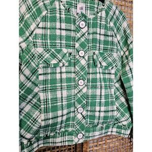 This Cabi Women's Jacket is a stylish and versatile piece perfect for various occasions from casual to formal. The green, white, and black plaid tweed pattern adds a classic touch to the blazer, while the fringe hem adds a trendy and unique detail. Made from 100% cotton with a lining of 100% polyester, the jacket is machine washable and suitable for all seasons. Featuring a one-button sleeve button style and a five-button front closure, this tailored and lined jacket in size M offers a classic fit for any woman's wardrobe.
