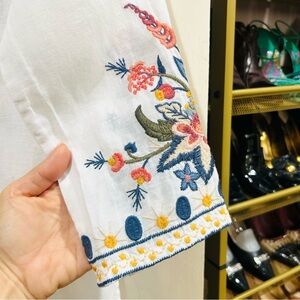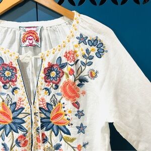 NWOT Johnny Was Linen Embroidered Boho Tunic Floral Tie Neck Peasant Top Size S