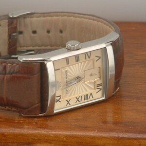 Pre-Owned Men’s Vintage Emporo Armani AR-0248 Leather Band Dress Watch-Stainless Steel Back -Stainless Steel Bezel -Quartz Movement-Leather Band-In Good Condition -Signs of Wear- Blemishes -Gold & Brown Color-Fits 7 inch Wrist-Works!!!