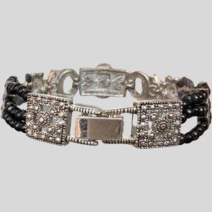 Art Deco Style Beaded Bracelet 7.5in Silver Tone Black Beads Retro